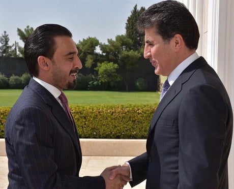 Halbousi (L) shakes hands with Nechirvan Barzani, deputy president of the KDP and KRG prime minister, on Saturday. Photo: Halbousi/Twitter