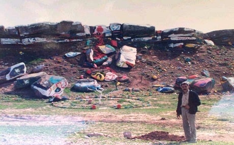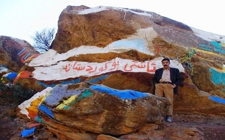 Ismail Khayat standing in front of a painted rock that reads "Peace for Kurdistan" during the Kurdish Civil War in the mid-1990's. Photo: Ismail Khayat