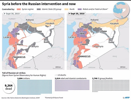 AFP infographic showing developments in Syria after one year of Russian engagement.