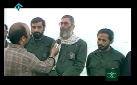 Ali Khamenei surrounded by the head of IRGC at the time Mohsen Rezaei (left) and Mohsen Rafiqdoost, the minister of the IRGC in July 1987 in the Persian Gulf.