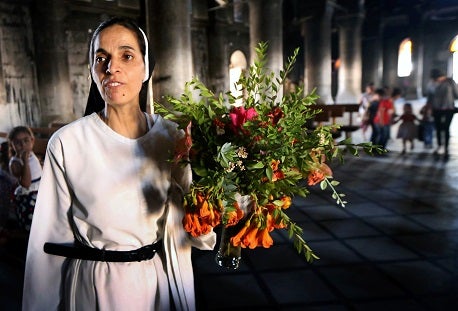 An Iraqi nun holds a flower bouquet as she attends a mass at the same Church.