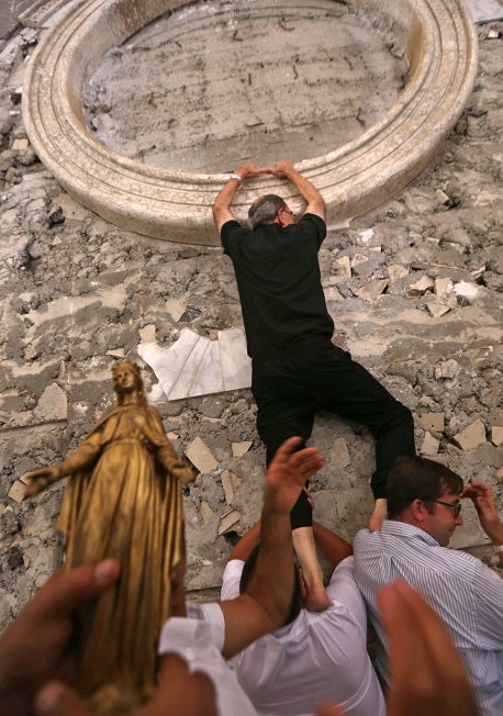 Barbarin puts up a statue of Virgin Mary on the wall of a church in east Mosul