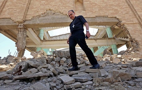 Lyon's Archbishop Cardinal Philippe Barbarin stands next to ISIS graffiti reading "There is no other god, but Allah and Mohammed is the Messenger of Allah" during a visit to the Church of the Annunciation in east Mosul.