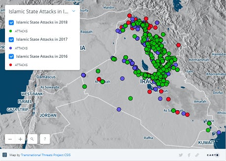 A screenshot of a CSIS graphic showing ISIS attacks in Iraq in 2016 (red), 2017 (purple), and 2018 (green).