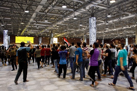 Protesters march through the terminal of Najaf International Airport. Photo: Haidar Hamdani/AFP