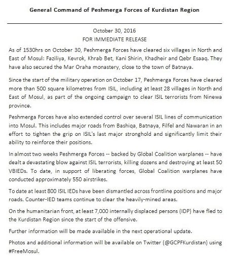 The General Command of Peshmerga Forces has released a statement announcing the liberation of another six villages in the Mosul offensive. Over the two weeks of the offensive, the Kurdish forces have cleared more than 500 square kilometres from ISIS.
