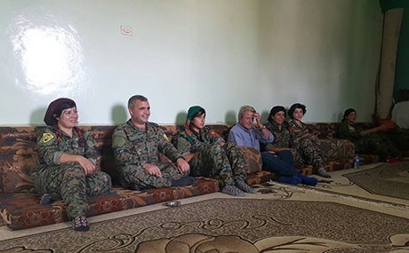 Bernard Kouchner sits with members of the SDF on a recent visit to northern Syria. Photo: SDF