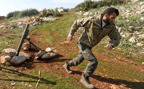 A Turkish-backed Syrian rebel fighter runs for cover after firing a mortar shell from Idlib province towards YPG locations in Afrin on Monday. Photo: Omar Haj Kadour/AFP