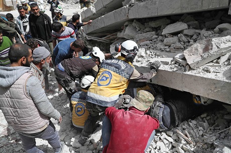 Members of the Syrian Civil Defence (White Helmets) search the rubble of a collapsed building following an explosion in the town of Jisr al-Shughur, Idlib, on April 24, 2019. Photo: Omar Haj Kadour/AFP