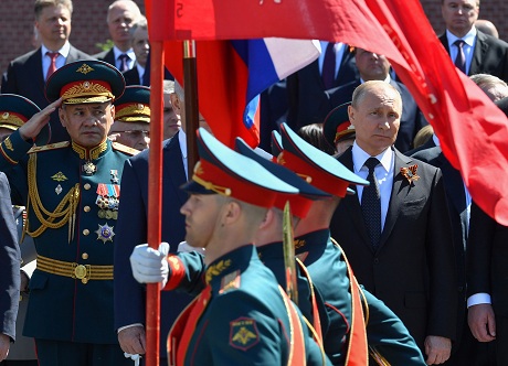 Russian President Vladimir Putin and acting Defence Minister Sergei Shoigu (left) take part in a wreath laying ceremony marking the 73rd anniversary of the Soviet Union's victory over Nazi Germany during World War II on May 9, 2018 at the Tomb of the Unknown Soldier by the Kremlin wall in Moscow. Photo: Yuri Kadobnov | AFP