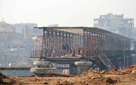 Construction work on Mosul’s Old Metal bridge, damaged during the military offensive to defeat ISIS in the city. Photo: Ahmad Muwafaq/AFP