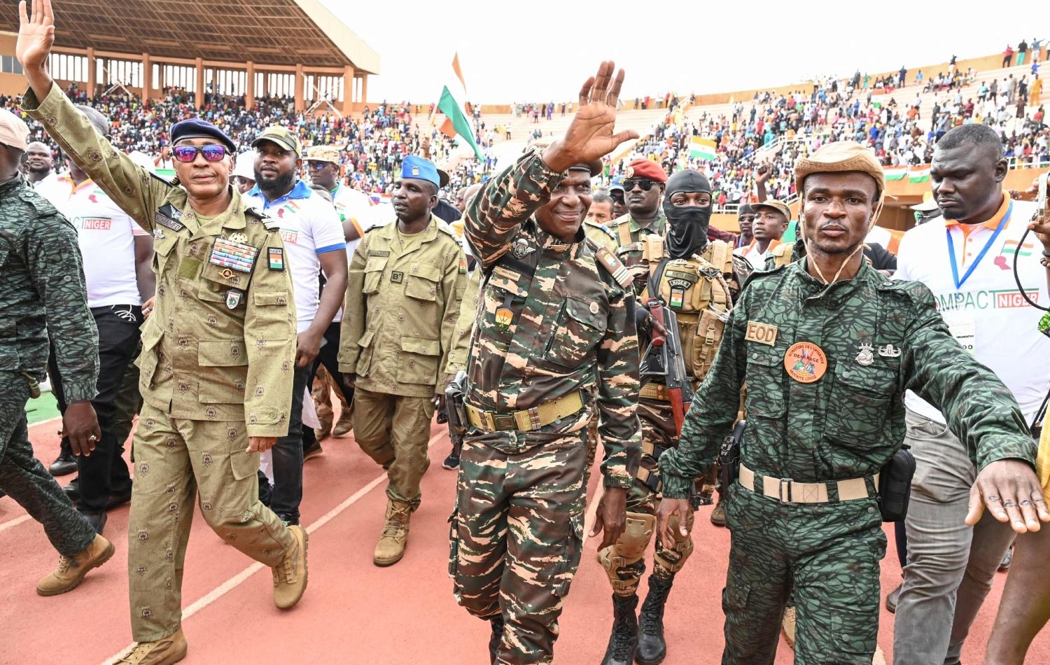 فەرماندە سەربازییەکانی ئەنجوومەنی سەربازیی نەیجەر لەنێو لایەنگرانیان لە یاریگەی نیامی لە 26ـی 8ـی 2023، وێنە: AFP