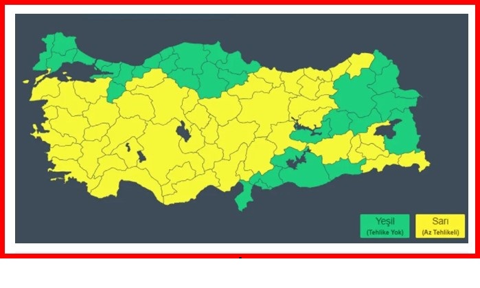 Sarı kodla uyarı yapılan iller: Adana, Afyonkarahisar, Ankara, Antalya, Artvin, Aydın, Balıkesir, Bitlis, Bolu, Burdur, Bursa, Çanakkale, Denizli, Diyarbakır, Erzincan, Eskişehir, Giresun, Gümüşhane, Hakkari, Isparta, Mersin, İzmir, Kayseri, Kırşehir, Konya, Kütahya, Malatya, Manisa, Maraş, Muğla, Nevşehir, Niğde, Ordu, Rize, Siirt, Sivas, Tokat, Trabzon, Dersim, Uşak, Yozgat, Aksaray, Bayburt, Karaman, Kırıkkale, Batman, Şırnak, Osmaniye.