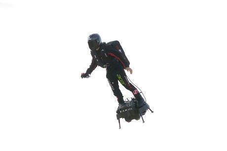 Yaklaşık 35 kilometrelik uçuşu sırasında, kaykayına yakıt ikmali yapan Zapata, yakıtını sırtında taşıyor.