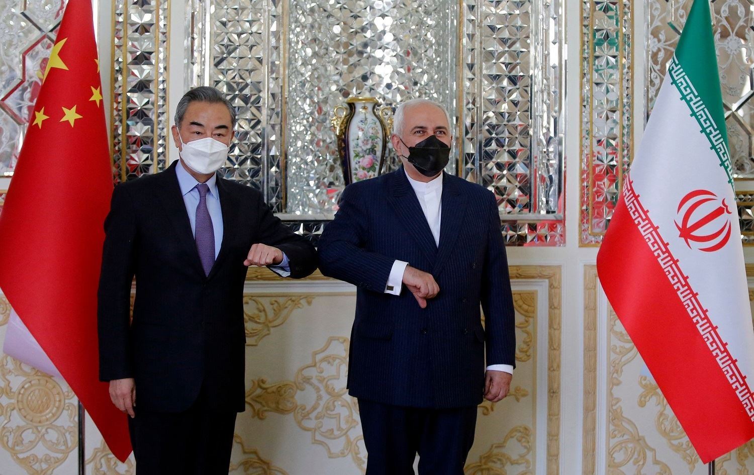 Iranian FM Mohammad Javad Zarif (R) greets his Chinese counterpart Wang Yi in Tehran on March 27, 2021. Photo: AFP