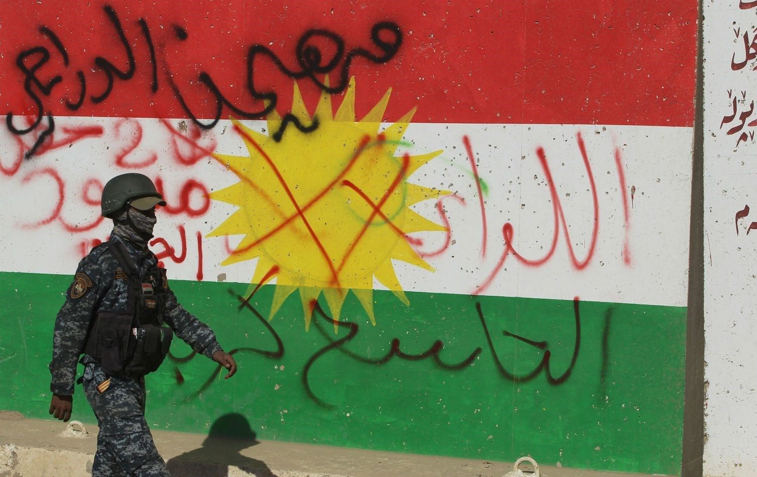 A member of the Iraq Security Forces strolls by a defaced wall in Kirkuk displaying the Flag of Kurdistan on October 16, 2017. File photo: Ahmed al-Rubaye / AFP