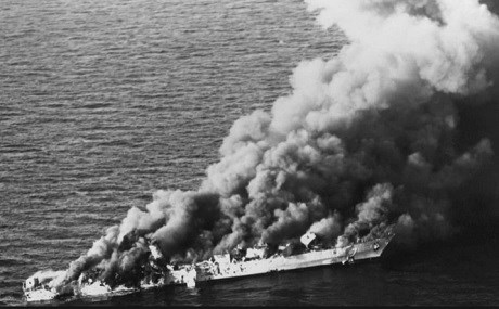 Iranian frigate Sahand burns after being attacked by the US Navy during Operation Praying Mantis, April 18, 1988. File photo: US Navy