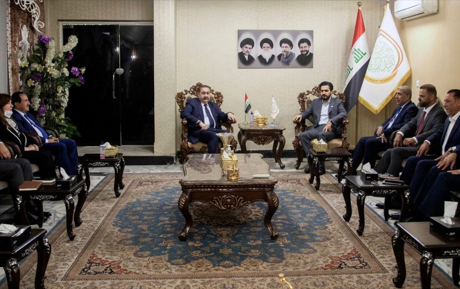 Hassan Al-Adari, head of the political body of the Sadrist bloc and Sadrists delegation, right, meets with Hoshyar Zebari, head of the Kurdish delegation, left, to negotiate forming a new government, taken on November 5, 2021. Photo: Hadi Mizban / AP Photo