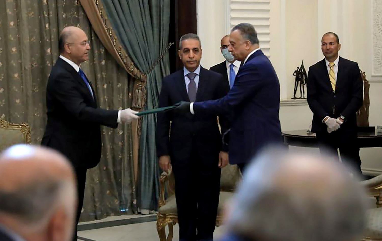 President Barham Salih (L) swears in Mustafa al-Kadhimi as Iraq’s new prime minister-designate in Baghdad, April 9, 2020. Photo: Iraqi Presidency Media Office