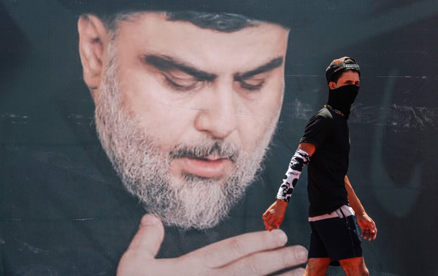 A mask-clad youth walks in front of a large poster of Iraq's populist Shiite Muslim cleric Muqtada al-Sadr in Baghdad's Sadr City on July 15, 2021. Photo: Ahmad al-Rubaye/AFP