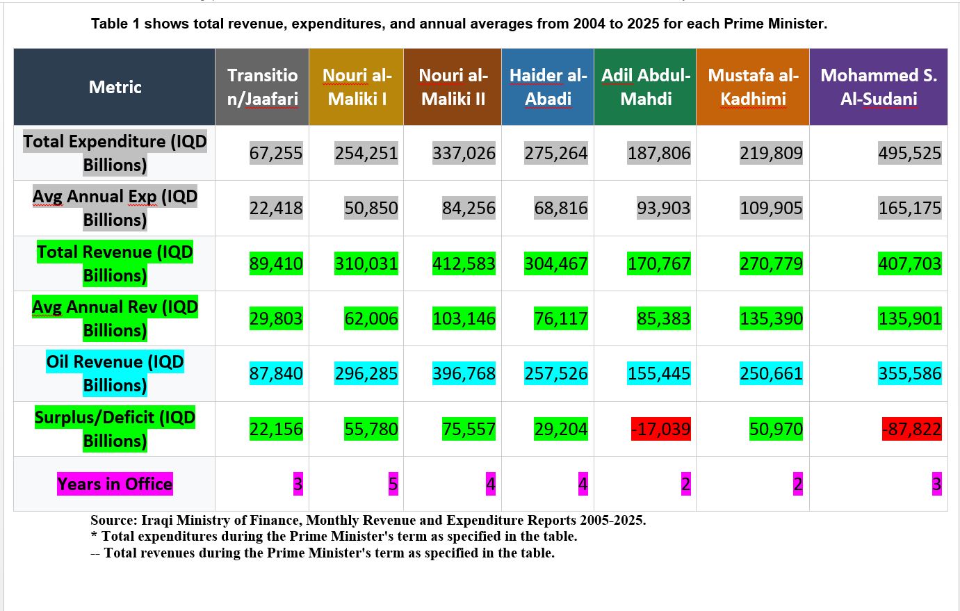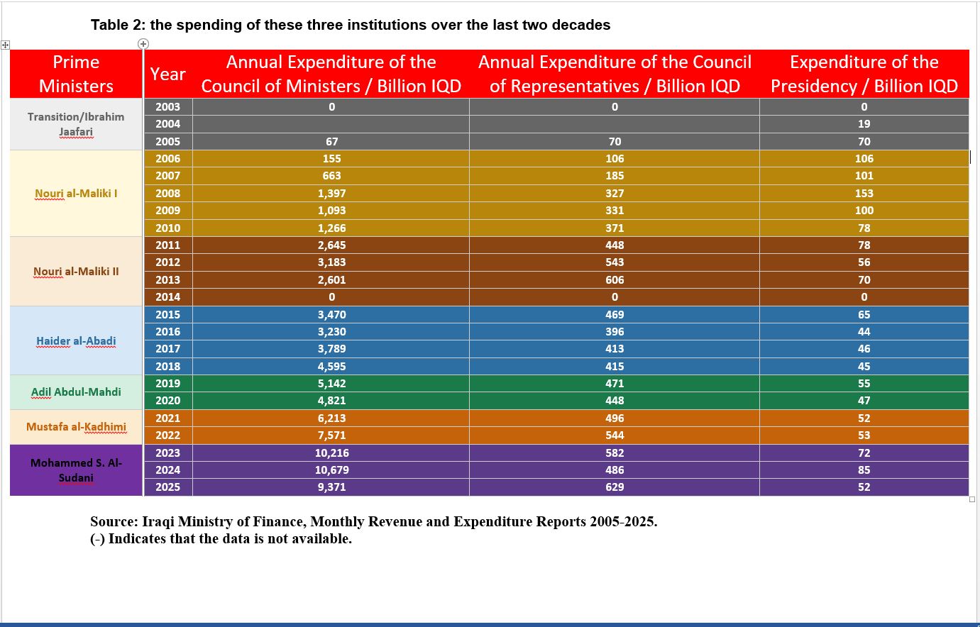 Since 2003, six prime ministers have led the Iraqi government for varying terms; Nouri al-Maliki served the longest, while Adil Abdul-Mahdi and Mustafa al-Kadhimi served the shortest. During Ayad Allawi’s tenure under the provisional government, there was no parliament-approved budget.