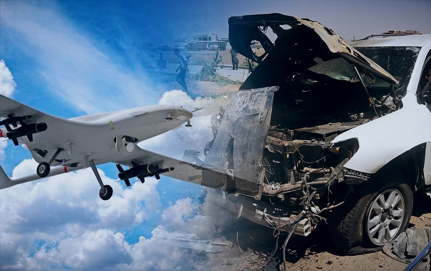 Left: File photo of a Turkish drone. Photo: Anadolu Agency. Right: The aftermath of a Turkish drone attack in Qamishli on August 22, 2021. Photo: Rojava Information Centre. Graphic: Rudaw