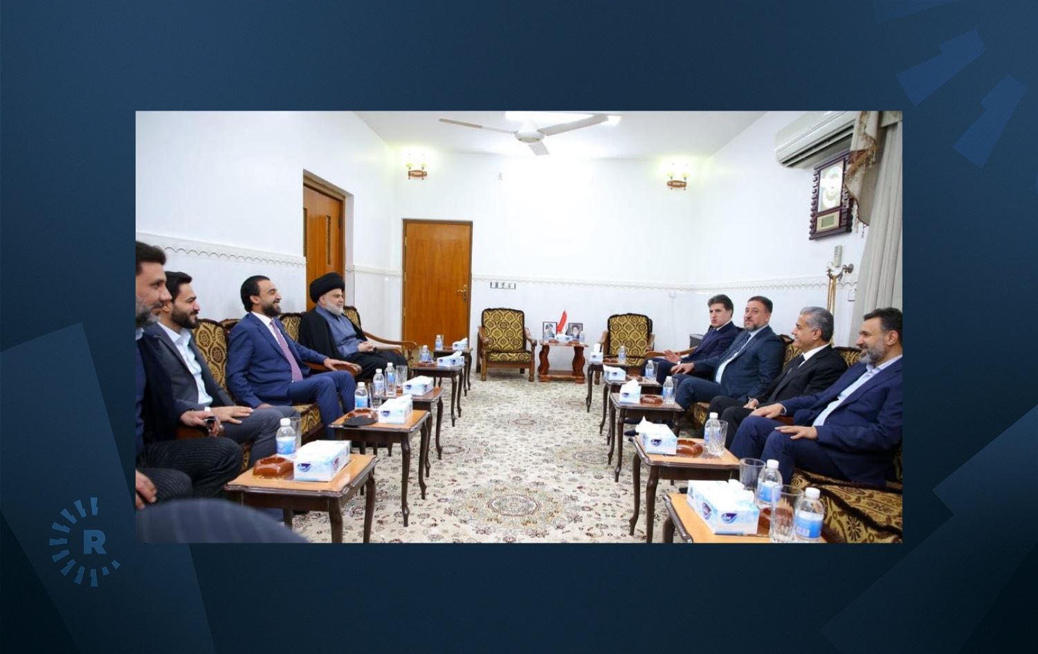 KDP Vice President Nechirvan Barzani, head of the Sunni Taqadum party Mohammed al-Halbousi, and leader of Sadrist Movement Muqtada al-Sadr meet in al-Hanana in Najaf province on January 31, 2022. Photo: Kurdistan Region Presidency