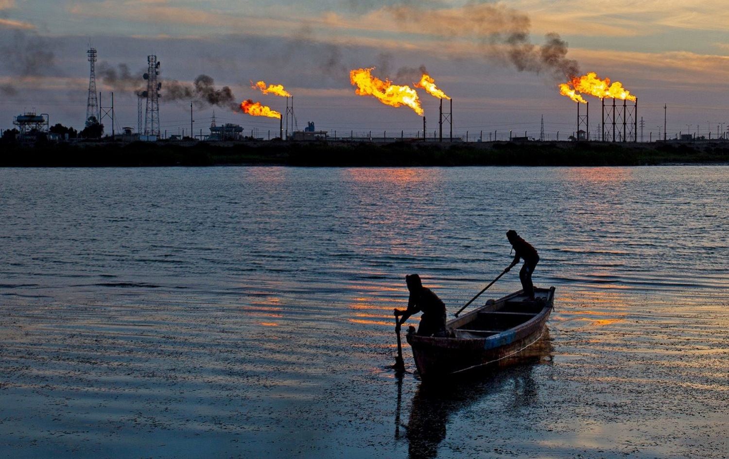 Iraqi fishermen row their boat near flare stacks burning at the Nahr Bin Omar field, north of Basra on January 21, 2021. File photo: AFP