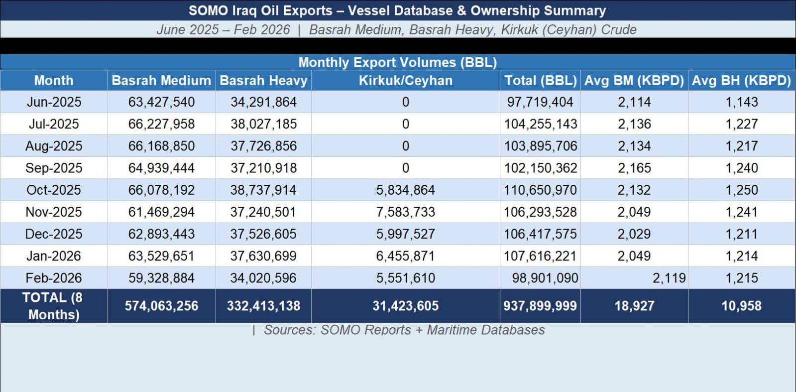 Over eight months, companies and countries transported 574 million barrels of Basra Medium crude, 332 million barrels of Basra Heavy crude, and 31 million barrels from fields in the Kurdistan Region.