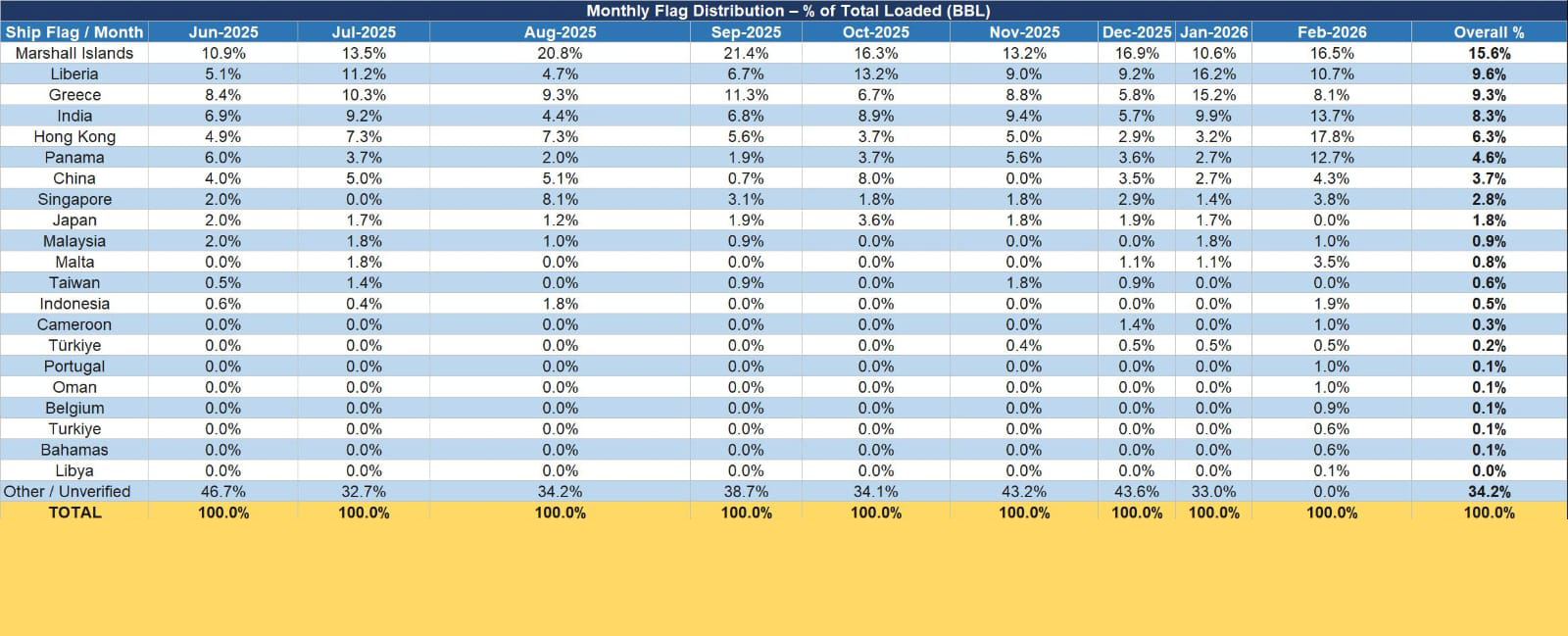 Most vessels transporting Iraqi oil sailed under flags from other countries. The largest share operated under the Marshall Islands flag (15.6 percent), followed by Liberia (9.6 percent), Greece (9.3 percent), India (8.3 percent), and Hong Kong (6.3 percent).