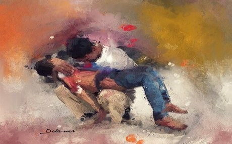 He explained that he was inspired to paint his “The Pietà of Syria” after seeing a poignant photograph of a Syrian father carrying his dead son following the bombing of the city of Homs by the Assad regime.