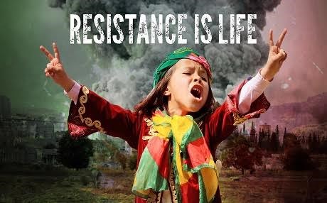 As a traumatized precocious and reporter/narrator, Evlin insists that “I take pictures of the pain around me.” She recalls and recounts the horrors of ISIS war against the beauty of her landscape and her joyous and now nostalgic childhood memories, navigating between the despicable “facts” and bitter reality of a refugee camp and lost childhood fantasies. However, the jovial smart child refuses to be reduced to a defenseless victim just to dream of her beautiful home (land). Evlin embodies and epitomizes the vibrancy and humanity of Kobane as the city fights on and fends off the barbarity of the enemy. With her parents she joins marches, takes part in funerals, whispers songs of resistance, dances along, even cheerfully clads herself in the flag of resistance. In this sense, the title of the film “Berxwedan jiyane” Resistance is Life, is animated in Evlin’s euphoric identity, which comes about in the intersection of the ravage of the war and a growing popular and feminist resistance.