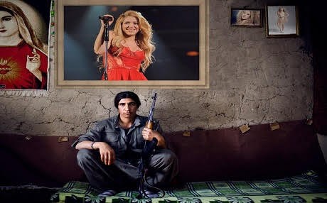 In one picture a Kurdish female fighter sits on a mud floor in front of the world famous Colombian singer Shakira. “Shakira has won attention with her beauty and her voice, and I think a Kurdish female fighter could receive as much attention with her long her, her Kurdish outfit and rifle.”