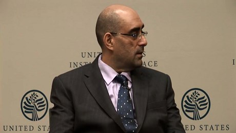 Dr. Elie Abouaoun speaks on the decline of Islamic State at a panel event in Washington D.C. in 2017. Photo: United States Institute of Peace video on social media