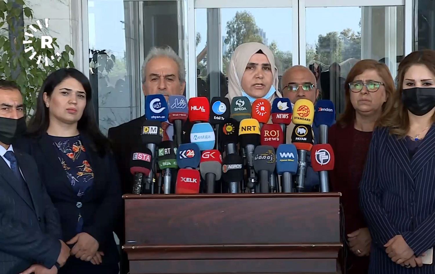 Badriya Sewaily, rapporteur from parliament’s Social Affairs and Protection of Human Rights Committee, surrounded by members of the committee, speaks during a press conference in Erbil on April 1, 2021. Photo: Rudaw