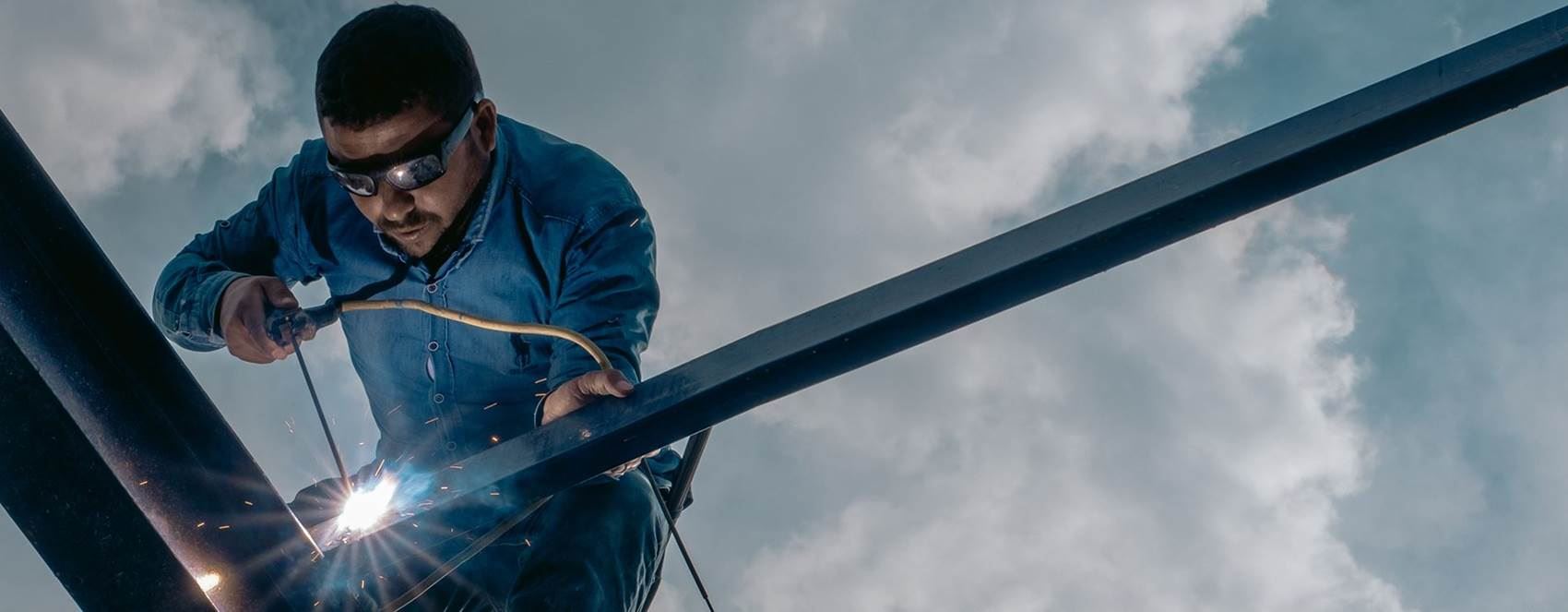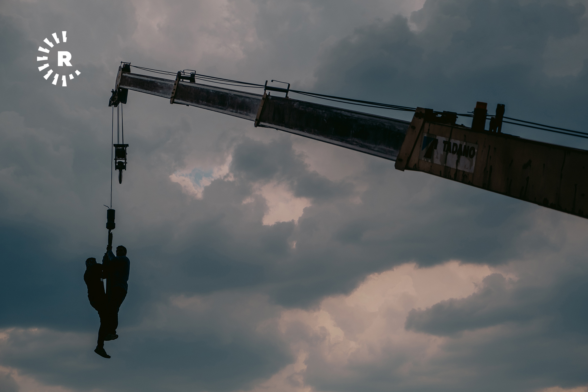The men operate heavy machinery and power tools without helmets or work boots, exposed to the battering wind without harnesses or ropes.