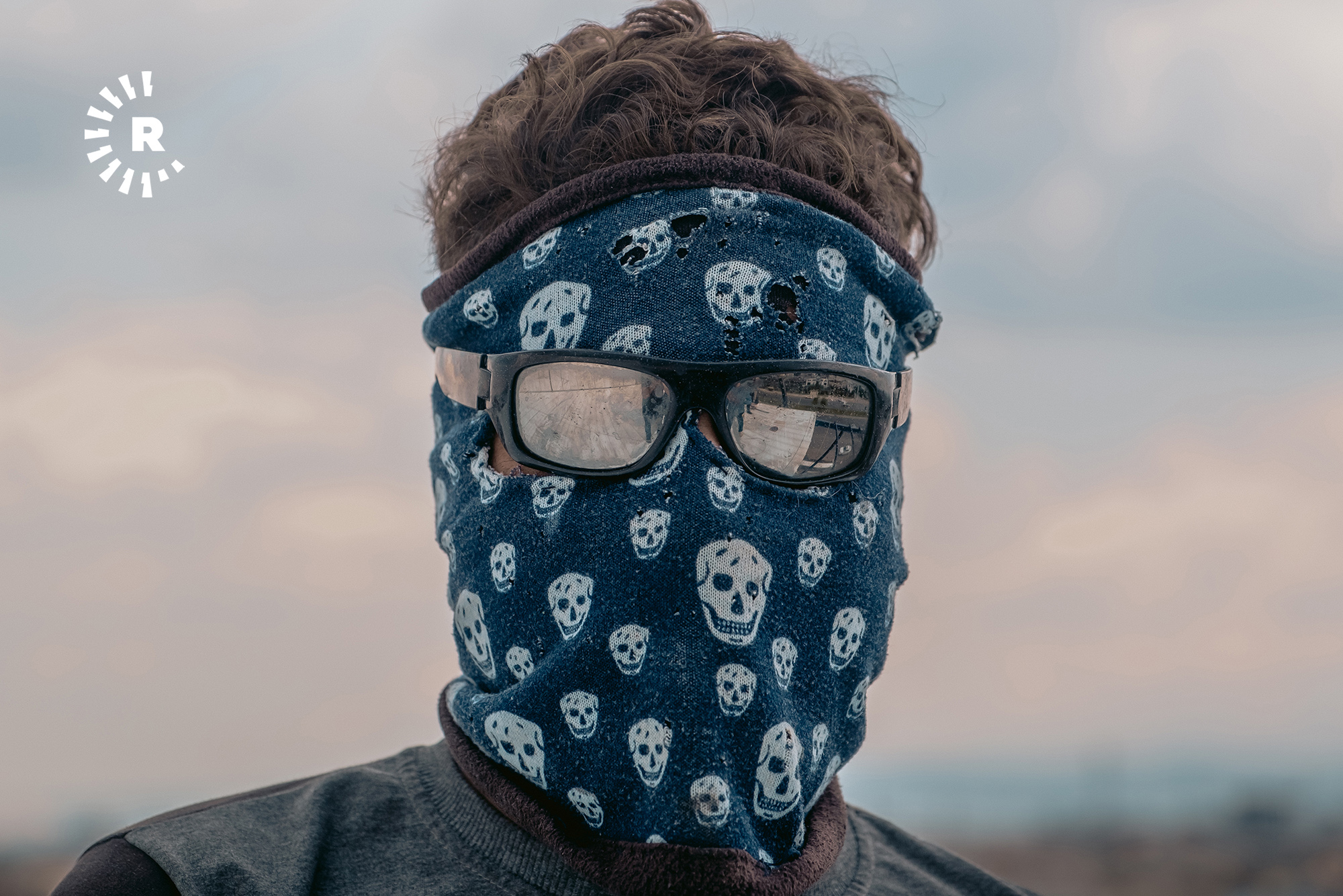 One of the men, Omar Shahab, wears a scarf around his face. He was injured earlier in the day and rushed to hospital after a stray spark burned his cheek.