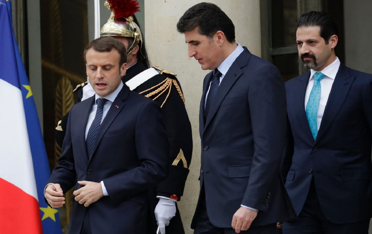 Then-KRG Prime Minister Nechirvan Barzani (center) and deputy PM Qubad Talabani (right) with French President Emmanuel Macron in Paris on December 2, 2017. File photo: Thomas Sanson/AFP