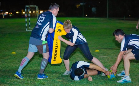Twice per week for the past year cold or heat, rain or shine, they organize "touch-rugby" where men and women play for two hours to learn the basics of spacing, passing, and hitting gaps (running lanes).
