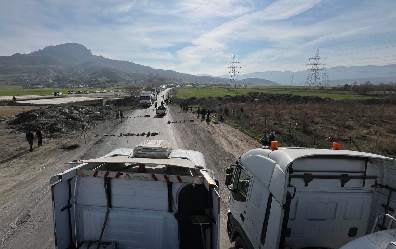 Protesters blocking trucks from accessing the main Sulaimani-Erbil highway on January 2, 2024. Photo: Mohammed Karwan/Rudaw