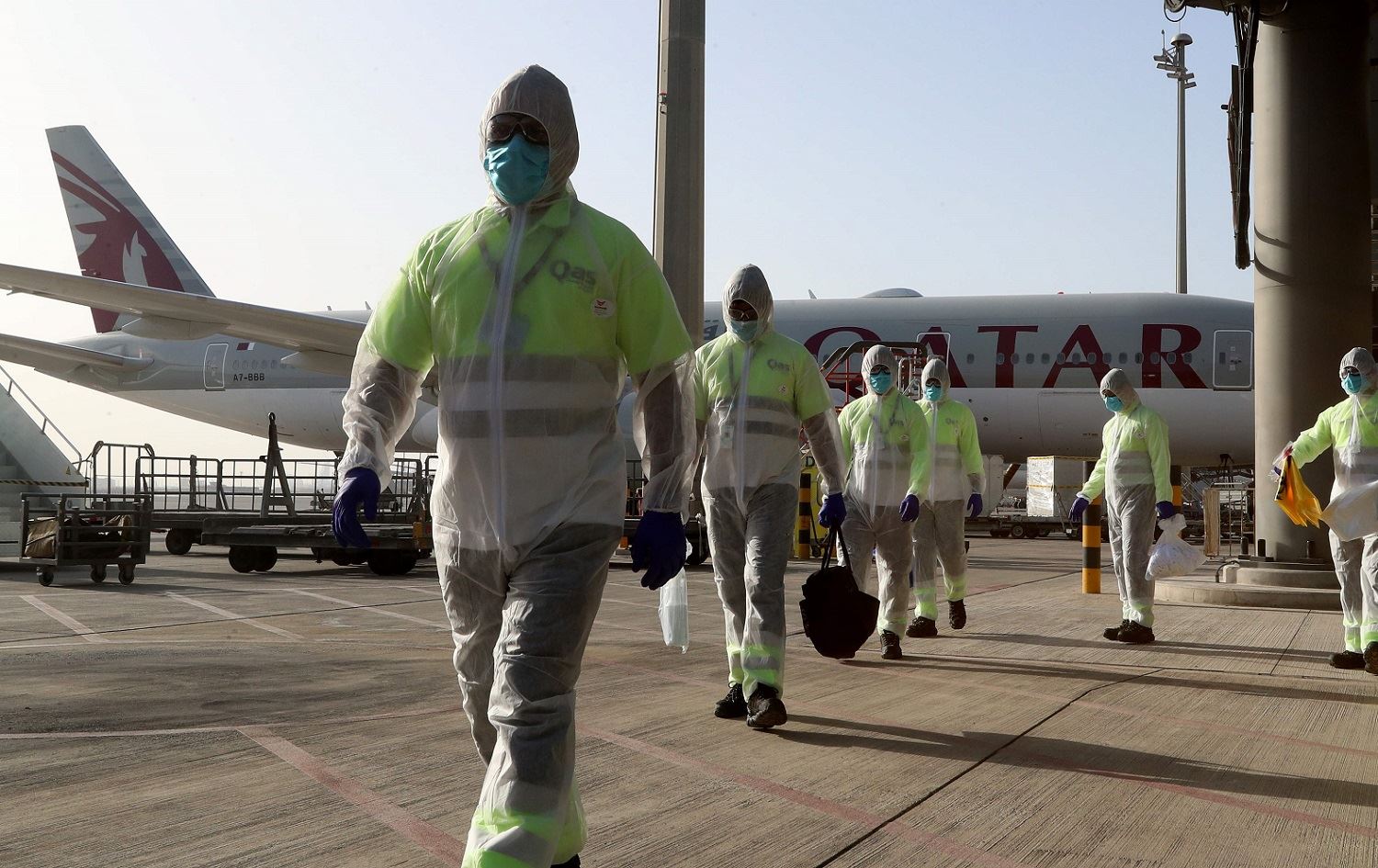 Employees of Qatar Aviation Services (QAS) sanitize an aircraft at Hamad International Airport in the Qatari capital Doha, April 1, 2020. Photo: Karim Jaafar / AFP