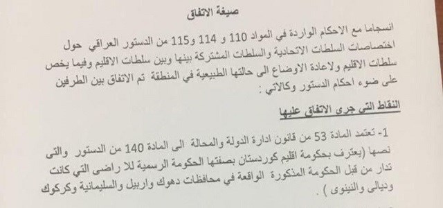 Based on Articles 110, 114, 115 of the Iraqi constitution concerning the powers of the Federal Government and the Regional Government (KRG) and to normalize the situation, the following agreement was reached between both sides, based on the constitution.