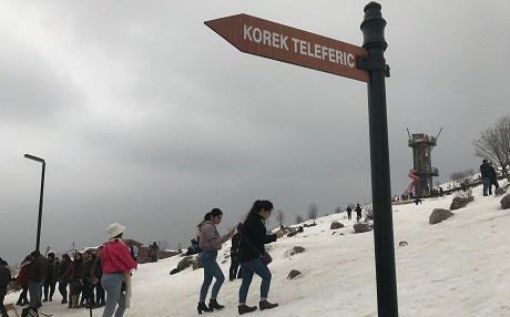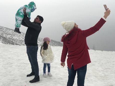 Arab tourists from Mosul, Baghdad, and other parts of Iraq ran up and down the mountain as they played excitedly in the snow. They dotted the white slopes with their colourful coats, hats, boots, and gloves. Children trailed their parents to one of the cafes while teenagers filled the mountainside with screams of joy as they flew overhead on a sky glider.
