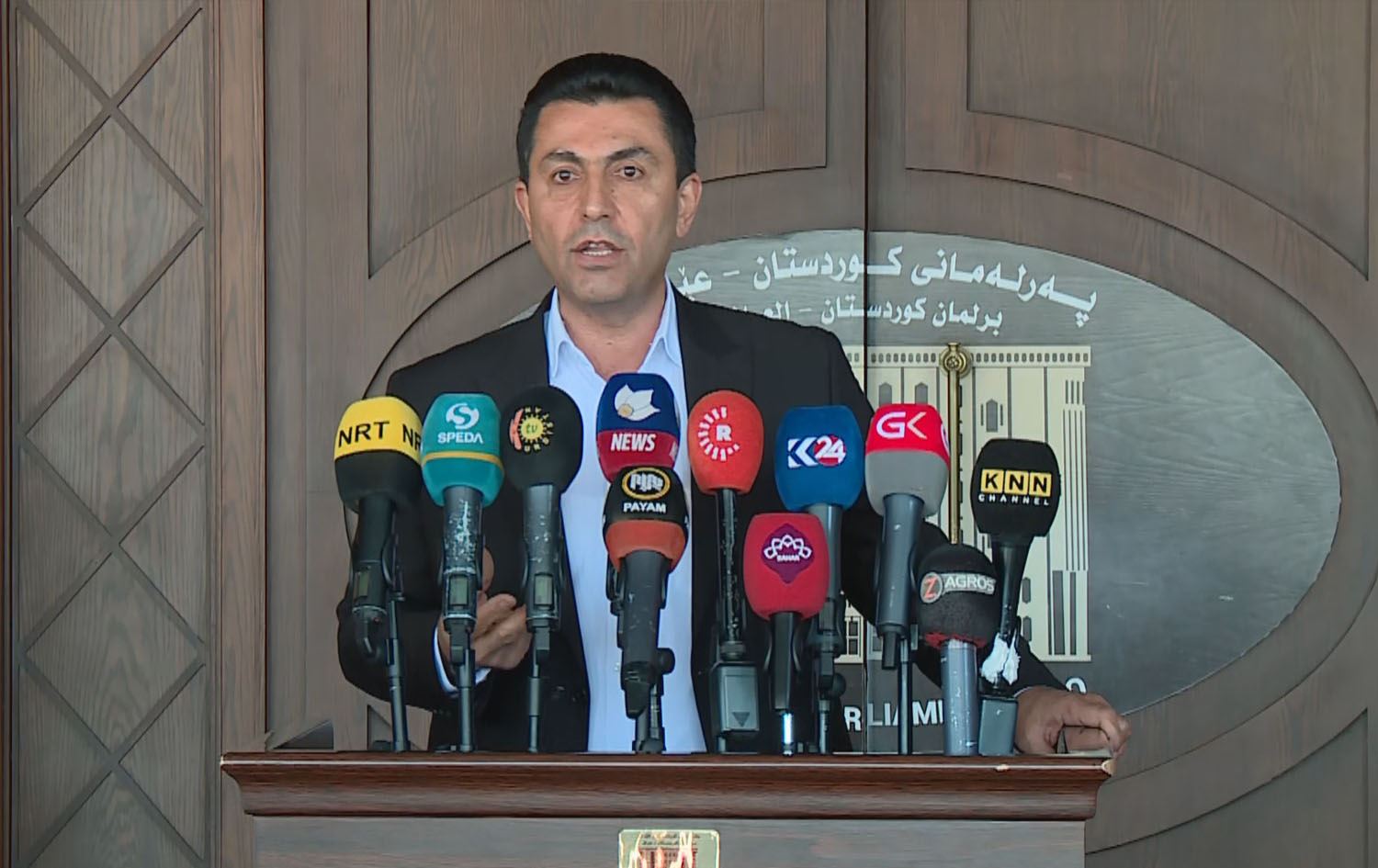 Luqman Wardi, a PUK MP, talking to reporters in Erbil on May 3, 2023. Photo: Screengrab/Rudaw