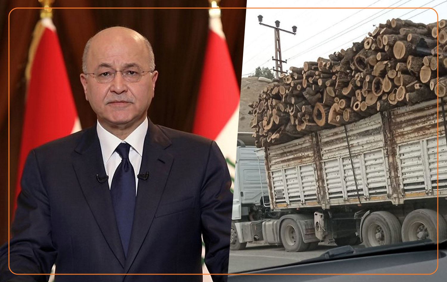 From left: file photo of Iraqi president Barham Salih, and truck filled with cut-down trees from the Kurdistan Region. Photos: Salih’s office and submitted.
