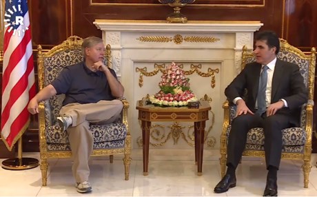 KRG Prime Minister Nechirvan Barzani (right) hosts a delegations of US officials including US Senator Lindsey (left) on July 3, 2018, in Erbil, Kurdistan Region. Video: Rudaw TV