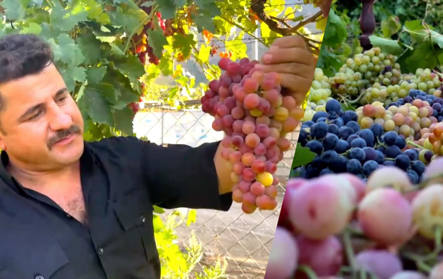 Tahsin Ibrahim, a local farmer, showcases his grape harvest, made up of over 70 types of grapes. He has been growing grapes for the past four years, observing them to see which type yields the best results.