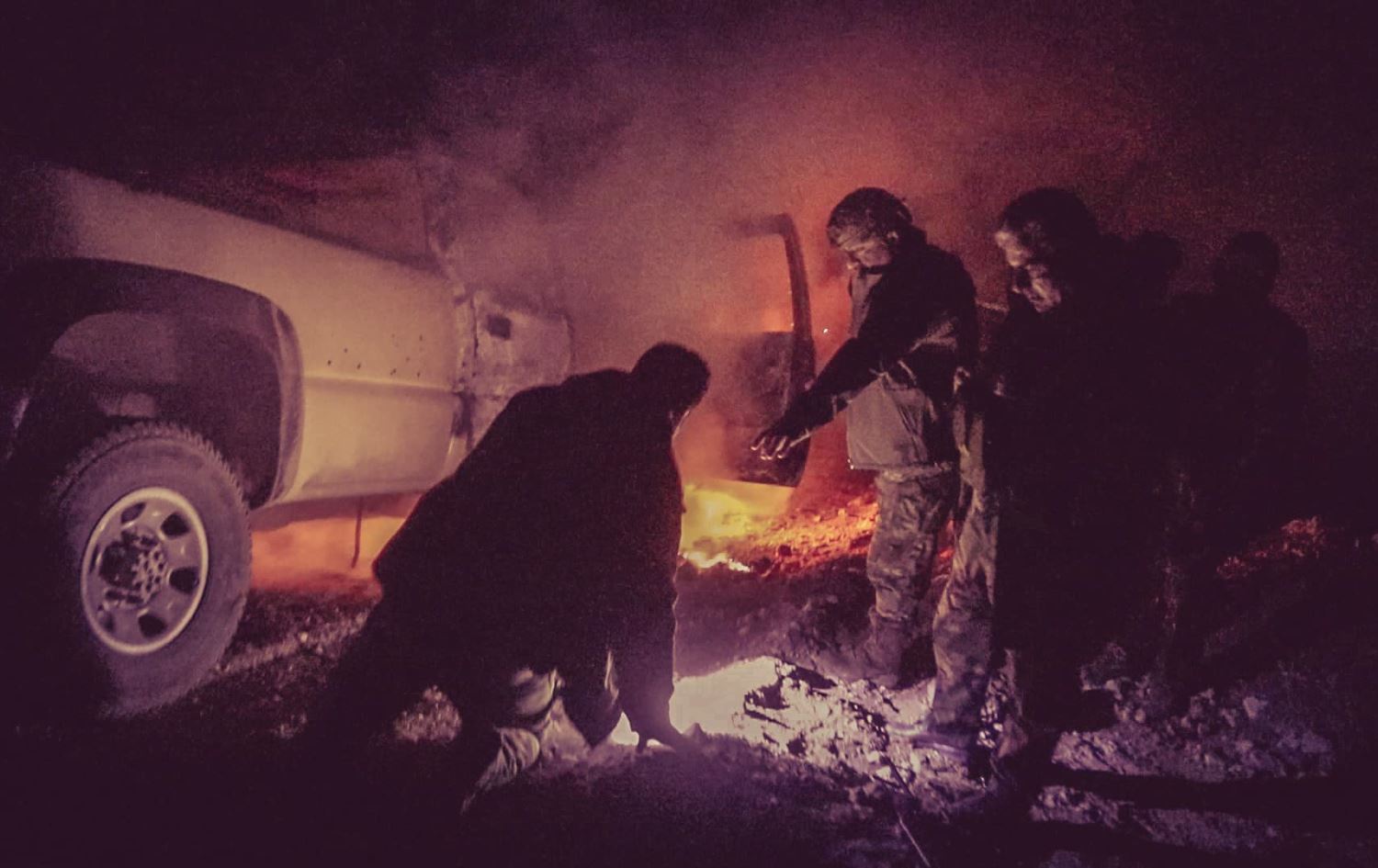 Peshmerga fighters are near one of their vehicles in Makhmour after being attacked by ISIS. Date: December 2, 2021. Photo: handout/Sirwan Barzani