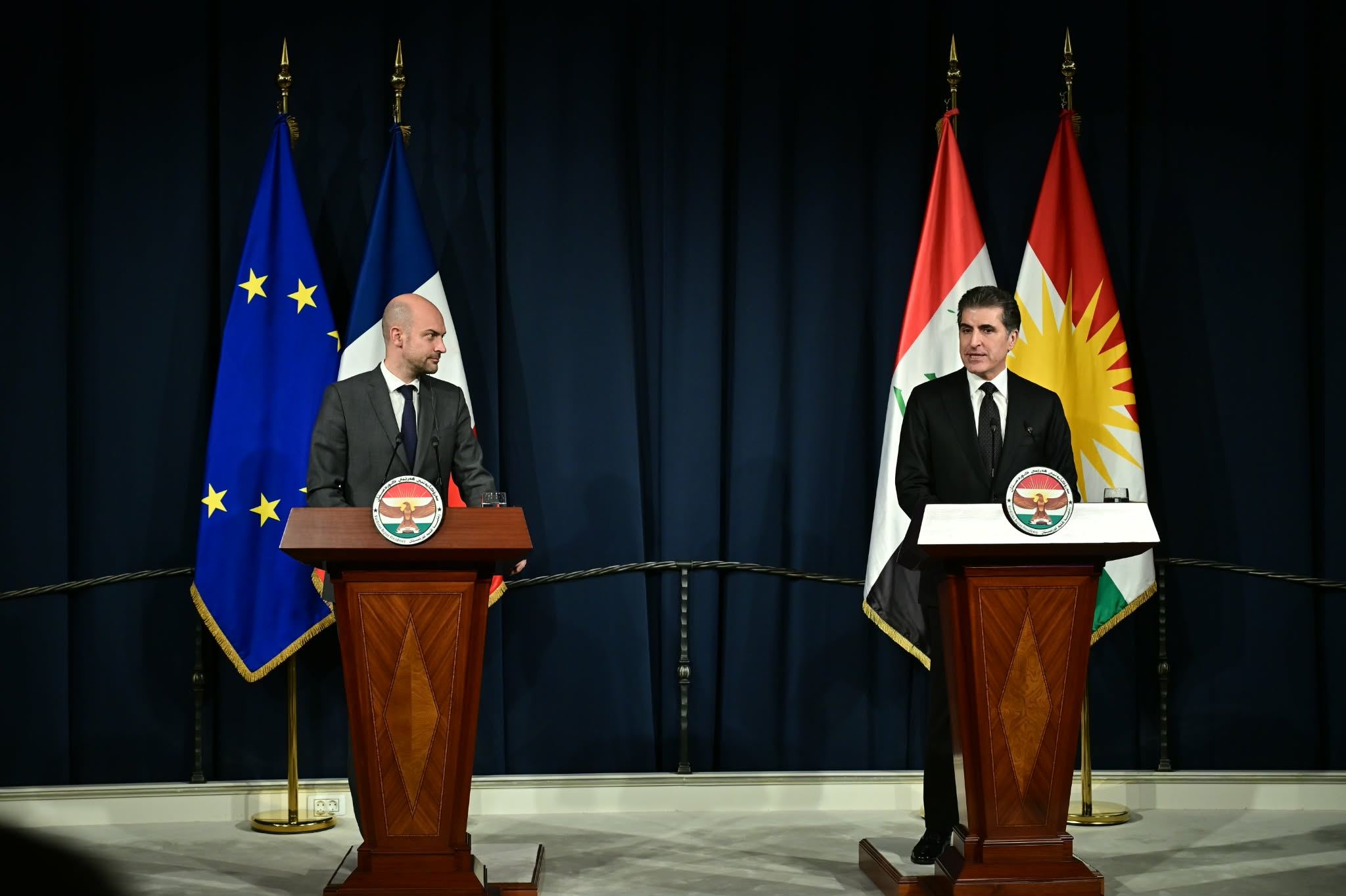 Barrot was received by Kurdistan Region President Nechirvan Barzani at the Kurdistan Region Presidency after arriving in Erbil International Airport. The two later held a joint press conference.