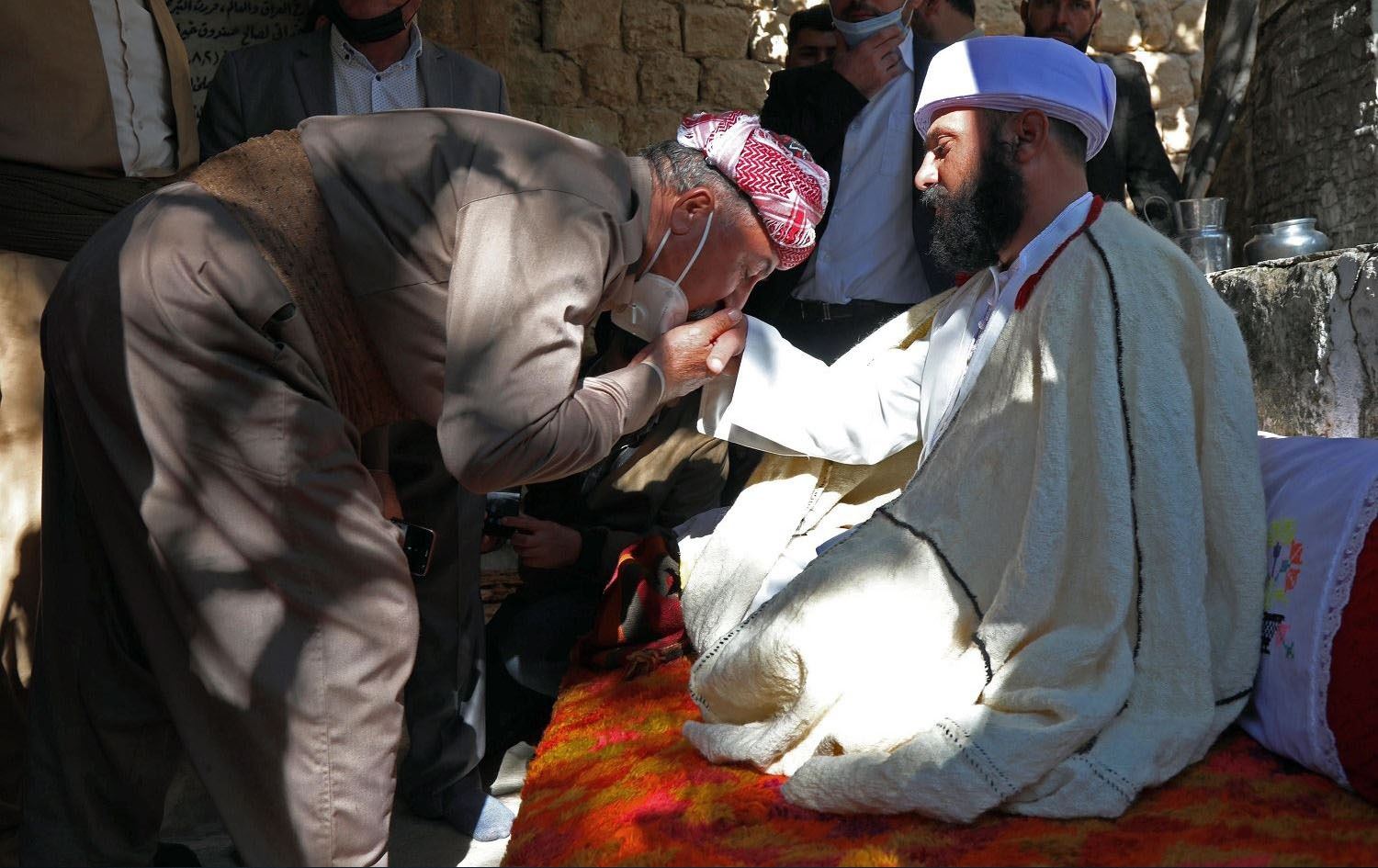 Baba Sheikh Ali Alyas (R) during his inauguration ceremony at the Lalish temple on November 18, 2020. Photo: Safin Hamed/AFP